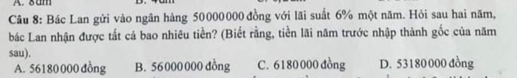 `50 000 000 : 100 xx 106 = 5 300 000` (đồng)