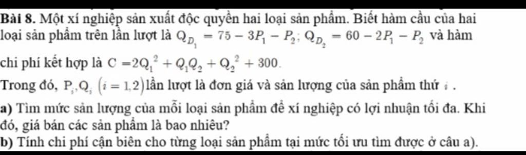 Bài 8. Một xí nghiệp sản xuất độc quyền hai loại sản phẩm. Biết hàm cầu của hai