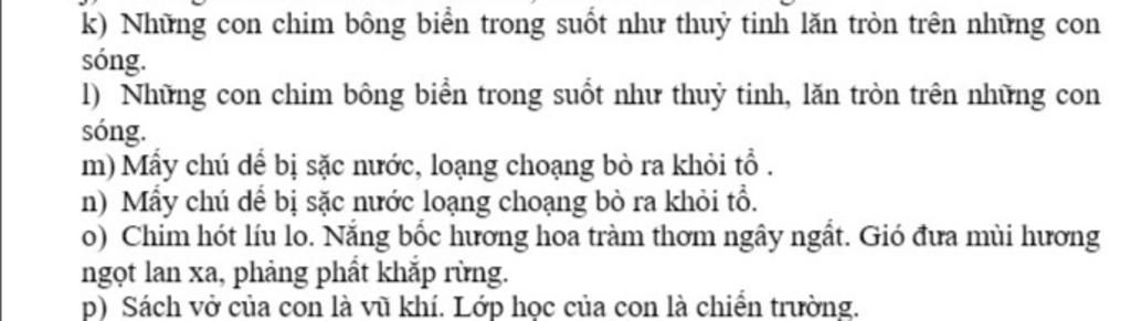 k)− Chủ ngữ: Những con chim bông biển. $\\$− Vị ngữ: trong suốt như thuỷ tinh lăn tròn trên những con sóng.$\\$l)− Chủ ngữ : Những con chim bông biển. $\\$− Vị ngữ : trong suốt như thủy tinh , lăn tròn trên những con sóng.$\\$m)− Chủ ngữ: Mấy chú dế. $\\$− Vị ngữ: bị sặc nước, loạng choạng bò ra khỏi tổ.⇒Được tách bởi dấu phẩy .$\\$n)− Chủ ngữ: Mấy chú dế bị sặc nước. $\\$− Vị ngữ: loạng choạng bò ra khỏi tổ.$\\$o)− Chủ ngữ 1 : Chim. $\\$− Vị ngữ 1 : hót líu lo. $\\$− Chủ ngữ 2 : Nắng. $\\$− Vị ngữ 2 : bốc hương hoa tràm thơm ngây ngất. $\\$− Chủ ngữ 3 : Gió. $\\$− Vị ngữ 3 : đưa mùi hương ngọt lan xa, phảng phất khắp rừng. $\\$⇒ Được tách bởi dấu chấm và dấu phẩy $\\$p)− Chủ ngữ 1 : Sách vở của con. $\\$− Vị ngữ 1 : là vũ khí.$\\$ − Chủ ngữ 2 : Lớp học của con. $\\$− Vị ngữ 2 : là chiến trường.$\\$$#minciukobeoi$