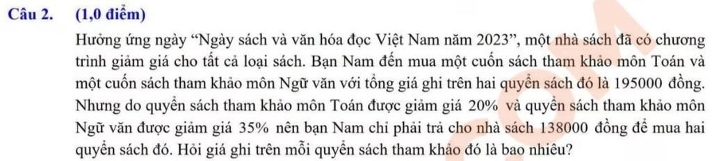 Gọi giá tiền của sách tham khảo Toán, Văn lần lượt là $x,y\ (0<x,y<195000)$.