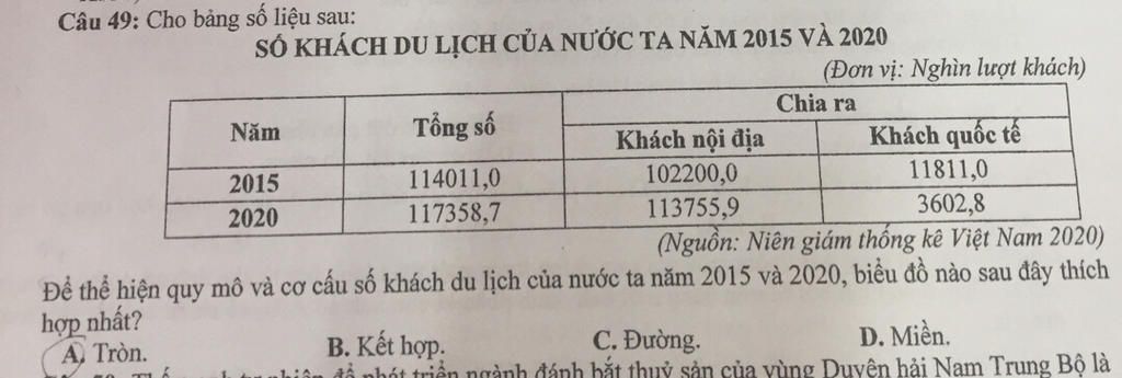 `->` Để thể hiện quy mô và cơ cấu số khách du lịch của nước ta năm `2015` và `2020`, biểu đồ thích hợp nhất là biểu đồ: Tròn