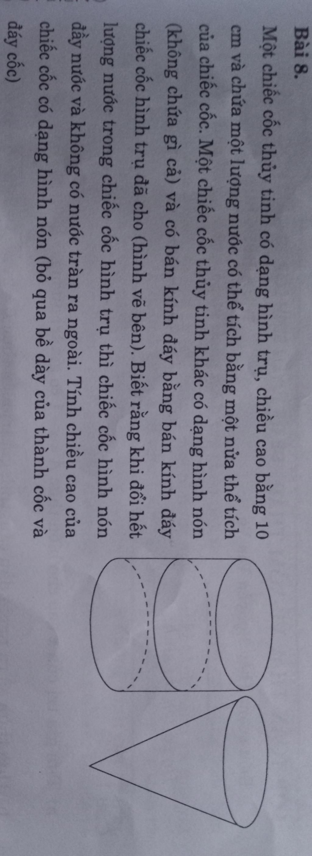 Do thể tích nước trong cốc hình trụ bằng thể tích cốc hình nón