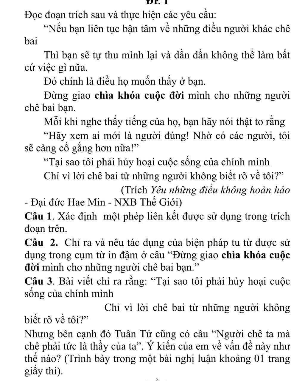 Câu 2: Biện pháp tu từ được sử dụng trong cụm từ "Đừng giao chìa khóa cuộc đời mình cho những người chê bai bạn" là một hình ảnh tu từ. Biện pháp này sử dụng hình ảnh của việc giao chìa khóa cuộc đời để tượng trưng cho việc trao quyền kiểm soát cuộc sống của mình cho những người chê bai. Ý nghĩa của biện pháp tu từ này là cảnh báo độc giả không nên để cho những lời chê bai của người khác chi phối cuộc sống của mình.