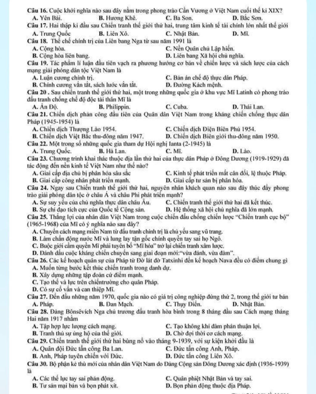 Câu 16: Cuộc khởi nghĩa nào dưới đây thuộc phong trào Cần vương ở Việt Nam cuối thế kỷ XIX?