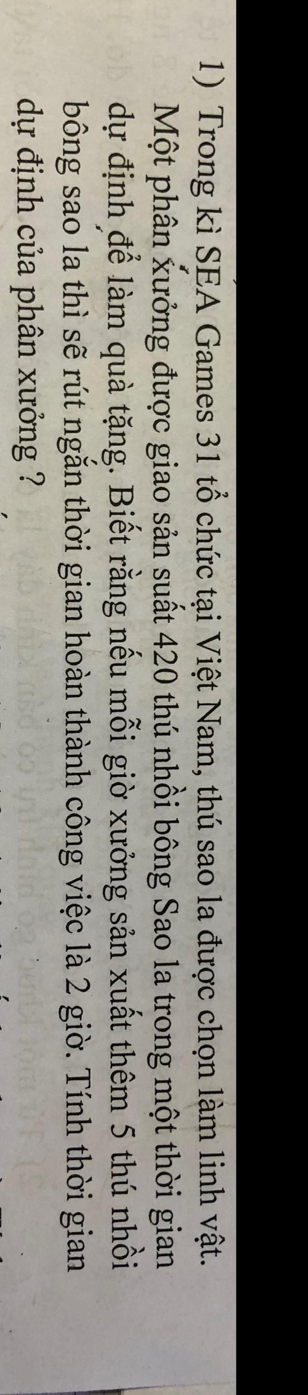 Do nếu mỗi giờ làm thêm `5` thú nhồi bông thì thời gian sẽ rút ngắn `2` giờ, ta có phương trình: