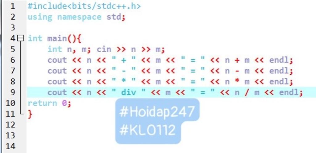 cout << m <<" div " << n << " = " << m / n << endl ;