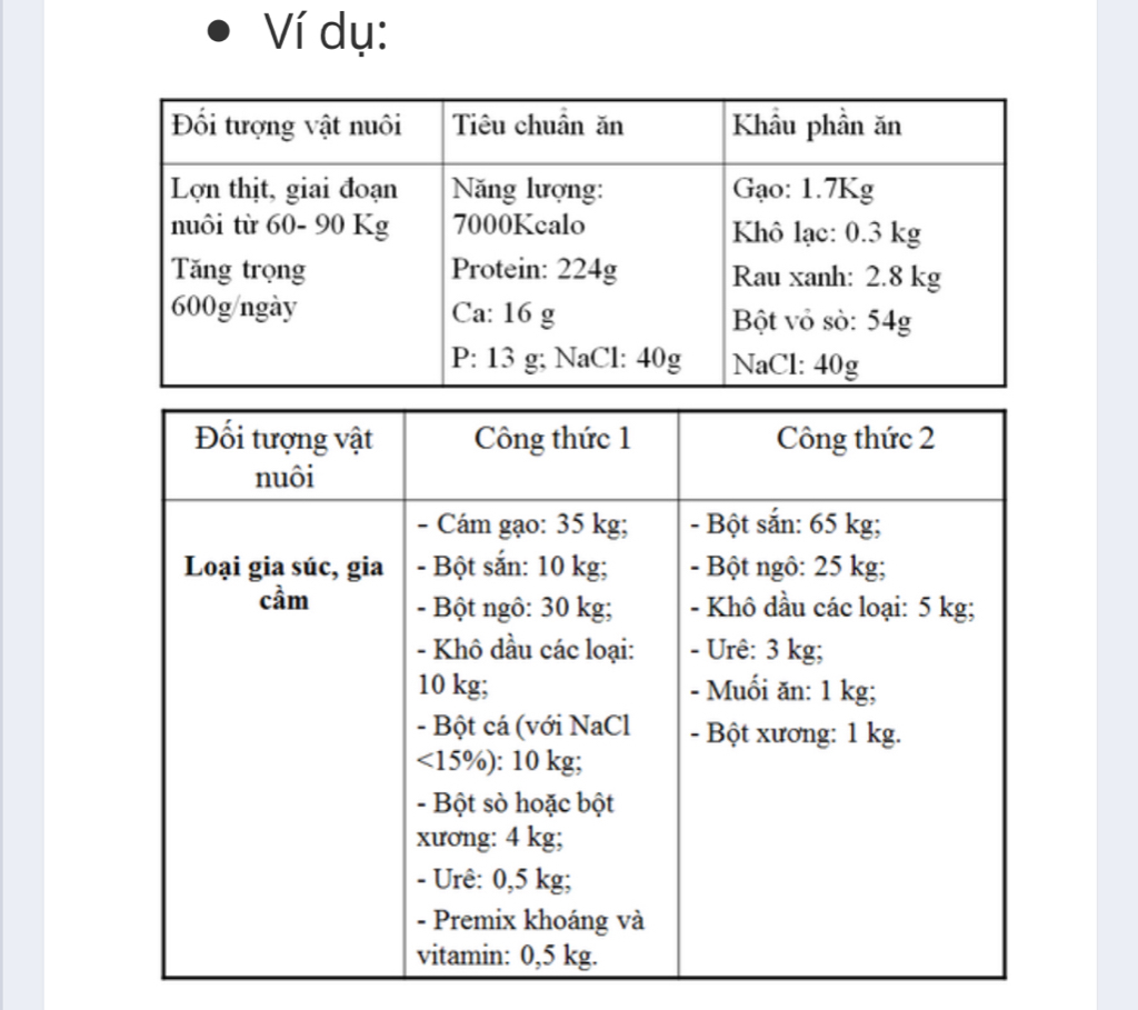 Khẩu phần ăn của vật nuôi là bảng cụ thể hóa tiêu chuẩn ăn bằng các loại thức ăn với khối lượng xác đinh và theo tỉ lệ hợp lí nhất