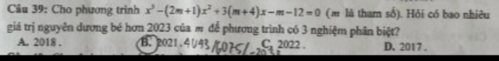 giá trị nguyên dương bé hơn 2023 của m để phương trình có 3 nghiệm phân biệt?