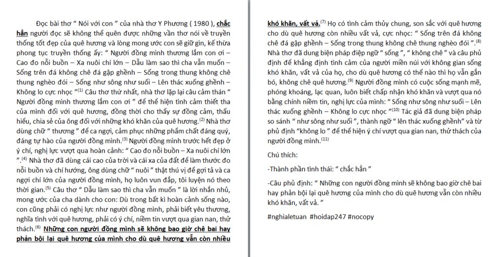 Qua bài thơ Nói với con của nhà thơ Y Phương đã cho ta thấy được người cha nói với con về đức tính cao đẹp của người đồng mình và những điều người cha mong muốn. Người cha muốn nói với con về vẻ đẹp của người đồng mình. Cụm từ "thương lắm con ơi" biểu cảm trực tiếp tình cảm yêu quý gắn bó thân thiết nhưng trong đó có cả sự cảm thông chia sẻ nhọc nhằn. Hai câu thơ 4 chữ như đăng đối "cao đo nỗi buồn xa nuôi chí lớn" cho thấy người đồng mình biết lo toang và giàu ước mơ. Hình ảnh ẩn dụ+so sánh, thành ngữ "sống như sông như suối" khẳng định một bản lĩnh sống mạnh mẽ khoáng đạt tràn đầy niềm vui và tinh thần lạc quan. Kết cấu tương phản+ cách diễn đạt thô sơ "thô sơ da thịt-> nhỏ bé" người cha khẳng định và ca ngợi lối sống hồn nhiên, thật thà mộc mạc chất phác nhưng giàu ý chí niềm tin. Họ biết tự lực, tự cương xây dựng quê hương đất nước với những phong tục tập quán tốt đẹp. Chắc hẳn, người cha mong muốn con biết nghĩa tình, thủy chung biết chấp nhận vượt qua khó khăn và muốn dạn dò con luôn biết tiến lên phía trước. Người cha không chỉ muốn nói với con về vẻ đẹp của người đồng mình mà còn những điều cha mong muốn. Người cha mong muốn con biết chấp nhận và vượt qua khó khăn, thử thách ý chí và mong muốn con phải nghĩa tình thủy chung.Người cha cũng mong muốn, dặn dò con bước trên đường đời và tự hào về truyền thống, quê hương và tổ quốc. Tác giả đã sử dụng những câu thơ bình dị, phù hợp với lời nói hằng ngày cùng nhiều biện pháp tu từ. Đồng thời, nhà thơ cũng bộc lộ cảm xúc thiết tha, yêu quý quê hương.