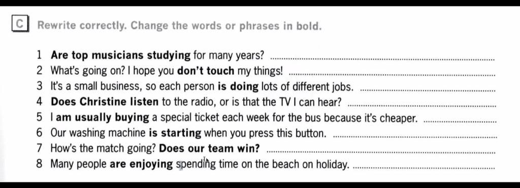 `-` Đây là bài trong Unit `1` ở Destination `1` `->` Học về thì HTĐ và HTTD `=>` viết lại câu chỉ cần chuyển từ thì HTĐ `->` HTTD và ngược lại.