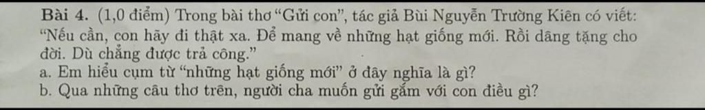 - Qua những câu thơ trên, người cha muốn gửi gắm tới con rằng " Mai sau con cũng sẽ lớn, cũng phải đi thật xa để bươn trải .Phải nếm trải sự khó khăn và vất vả để có thể kiếm được " hạt giống mới " cho đời ta.Bố mẹ không thể ở bên cạnh con, không thể chăm sóc cho con mãi mãi được.Thế nên, bản thân ta cần phải đi xa để có thể lấy được kiến thức và những bài học cuộc sống để có thể thành công trên con đường đời."