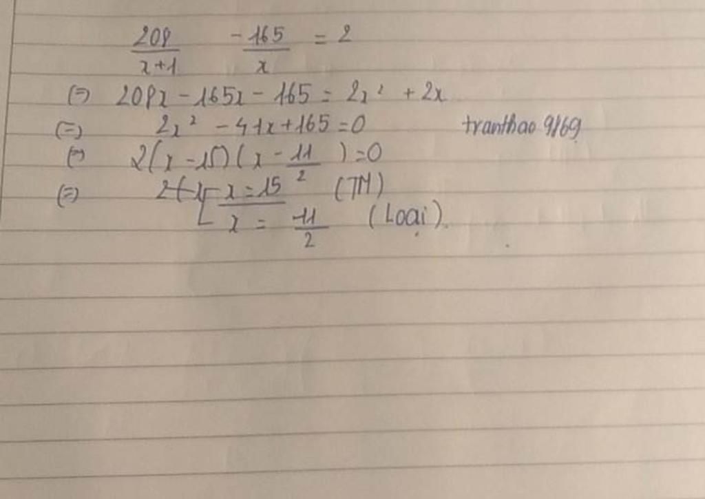 $\Leftrightarrow 165 + \dfrac{165}{x} + 2x + 2 = 208$