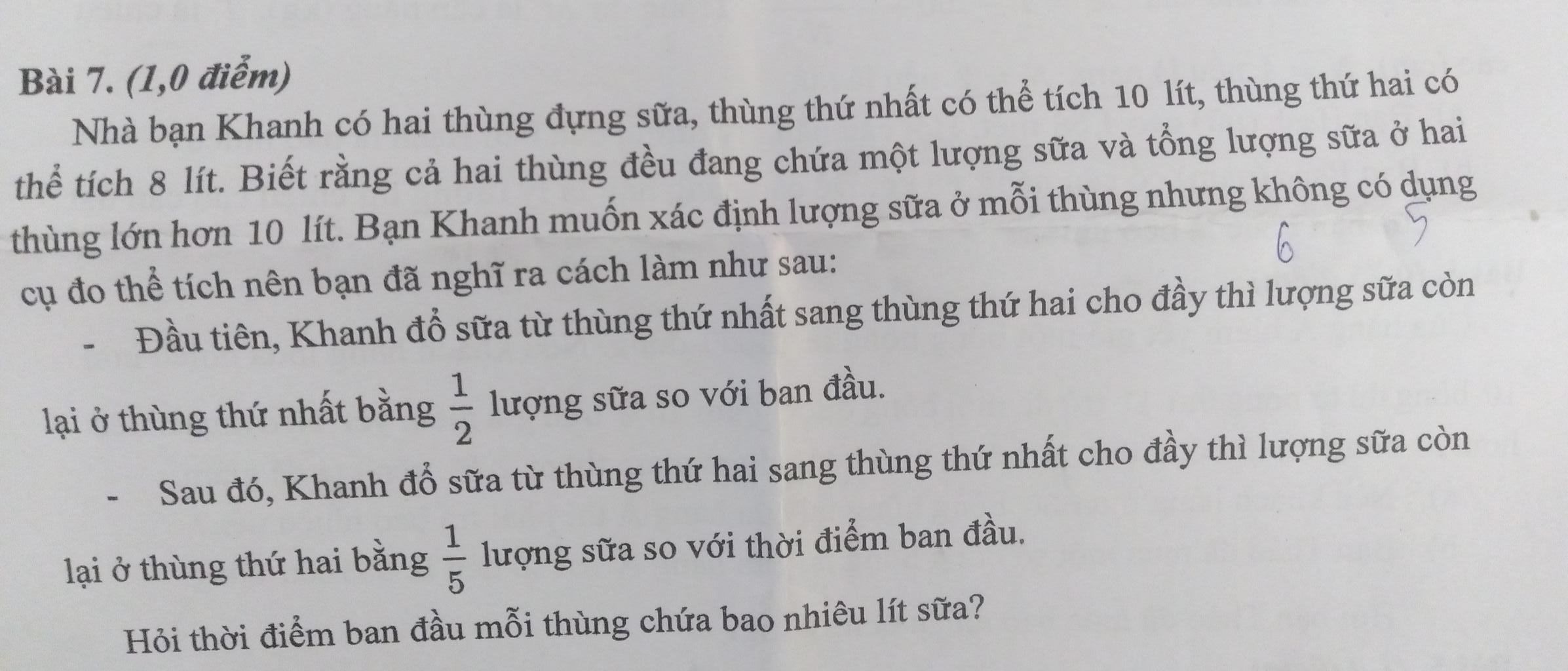 Sau đó, Khanh đổ sữa từ thùng hai sang thùng thứ nhất cho đầy thì lượng sữa còn lại ở thùng thứ hai bằng `1/5` lượng sữa so với thời điểm ban đầu