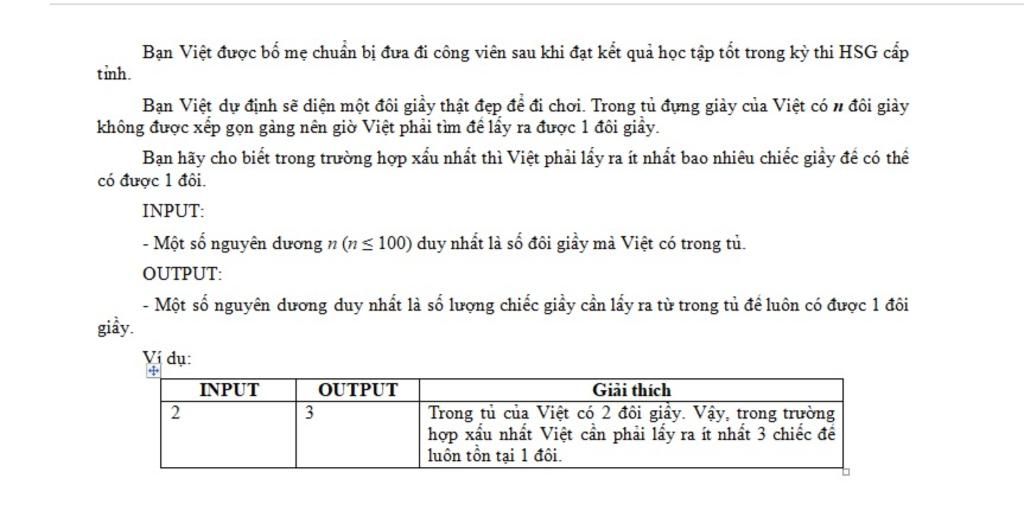 Vì vậy, Việt sẽ phải lấy `n+1` chiếc giày để chắc chắn có được `1` đôi trong trường hợp xấu nhất (đã lấy `1` chiếc giày của mỗi đôi nên chỉ cần lấy thêm `1` chiếc nữa chắc chắn sẽ có `1` đôi).