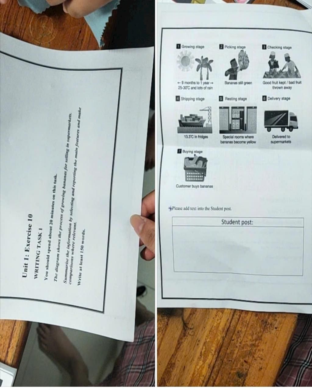 First, the bananas are planted for between 9 months to 1 year. During the process, the temperature should fluctuate around 25-30 Celius and needs a lot of rain. Second the picking stage, the banana must be picked when they are still green. Next, the bananas had to adapt to the quality of the checking stage, if not they will be thrown away. Then, they will be delivered on the boat at 13.3 Celius in the fridge and left in the special rooms where bananas become yellow. After that, they will be delivered on the lorries to supermarkets. Finally, customers will buy the bananas