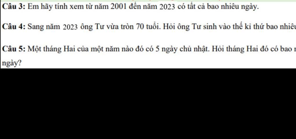 Từ năm `2001` đến năm `2023` có số năm nhuận là: `(2020-2004):4 + 1 = 5 (năm)`