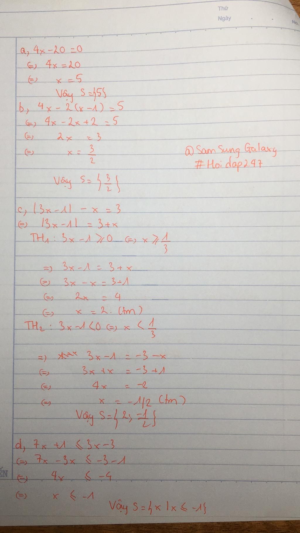 $\begin{array}{l} d)7x + 1 \le 3x - 3\\ \Leftrightarrow 7x - 3x \le - 3 - 1\\ \Leftrightarrow 4x \le - 4\\ \Leftrightarrow x \ge - 1 \end{array}$