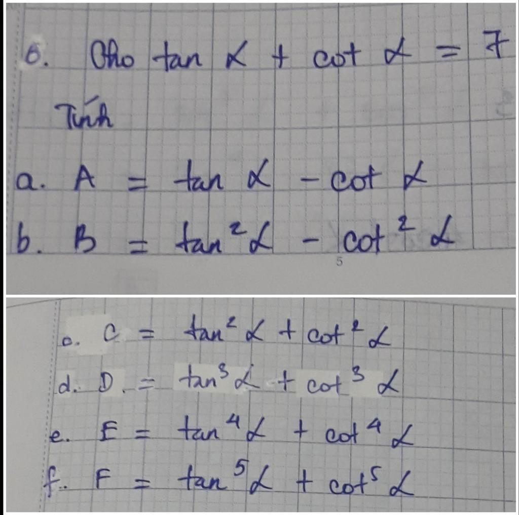 $\Leftrightarrow F = (\tan^3 \alpha + \cot^3 \alpha)(\tan^2 \alpha + \cot^2 \alpha) - \tan^2 \alpha \cot^2 \alpha (\tan \alpha + \cot \alpha)$