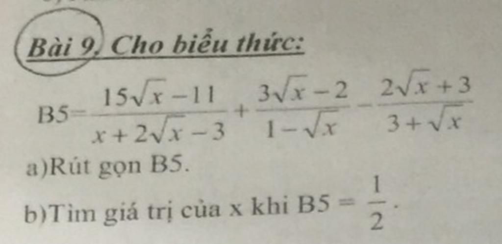 `B5=(15\sqrt{x}-11)/(x+2\sqrt{x}-3)+(3\sqrt{x}-2)/(1-\sqrt{x})-(2\sqrt{x}+3)/(3+\sqrt{x})` với `x>=0;x\ne1`