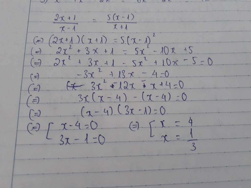 $\frac{2x +1}{x -1} = \frac{5.(x -1)}{x +1}$ $(ĐKXĐ:$ $x \neq ±1)$