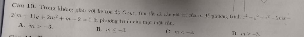 Phương trình $x^2 + y^2 + z^2 - 2mx + 2(m + 1)y + 2m^2 + m - 2 = 0$ là phương trình mặt cầu