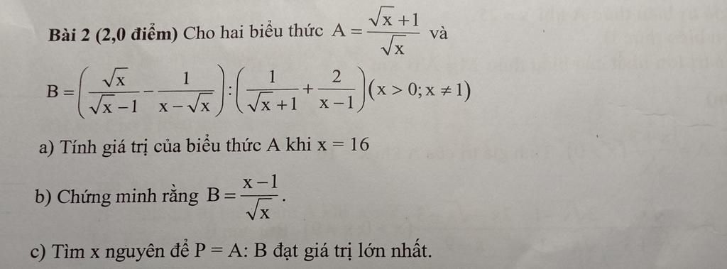 b, B= ($\frac{√x}{√x -1 }$ $\frac{√x}{√x -1 }$ - $\frac{1}{x-√x}$ ) : ( $\frac{1}{√x +1}$ + $\frac{2}{x-1}$ )