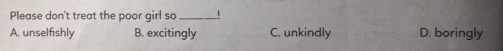 C. unkindly (adv): không tử tế,tệ bạc (đúng nghĩa)