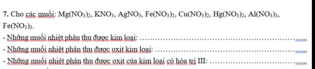 `-` Những muối nhiệt phân thu được oxit kim loại: $\rm Mg(NO_3)_2, Fe(NO_3)_2, Cu(NO_3)_2,Al(NO_3)_3,Fe(NO_3)_3$