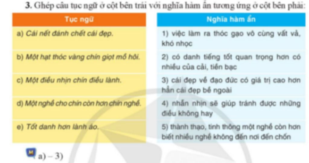 3. Ghép câu tục ngữ ở cột bên trái với nghĩa hàm ẩn tương ứng ở cột bên phải: