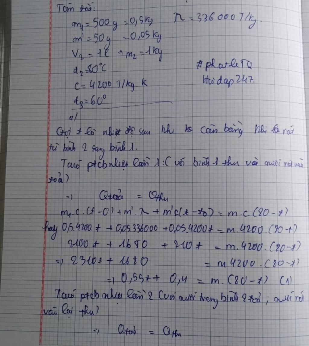 _ Bình 2 đựng 1 lít nước ở 80'C có c=4200J/KgK. Rót từ bình 2 sang bình 1 một lượng nước, chờ khi có cân bằng nhiệt thì rót trở lại từ bình 1 về bình 2 một lượng nước như lúc đầu, cuối cùng bình 2 có cân bằng nhiệt ở 60'C
