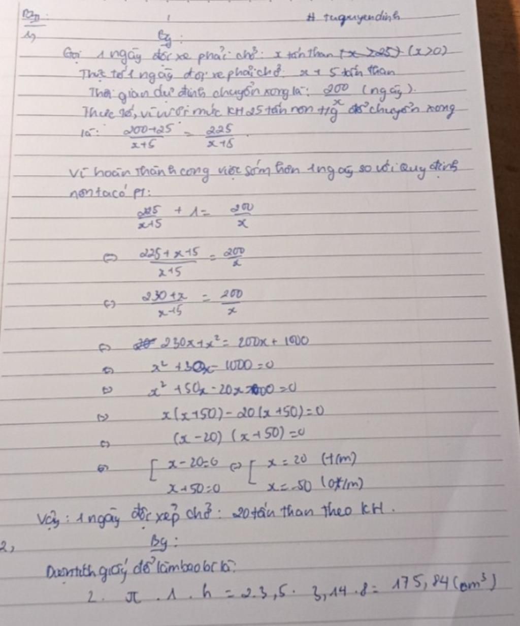 Thực tế mỗi ngày đội chuyển được `x+5` (tấn) và số tấn than chuyển được là `200+25=225` (tấn)