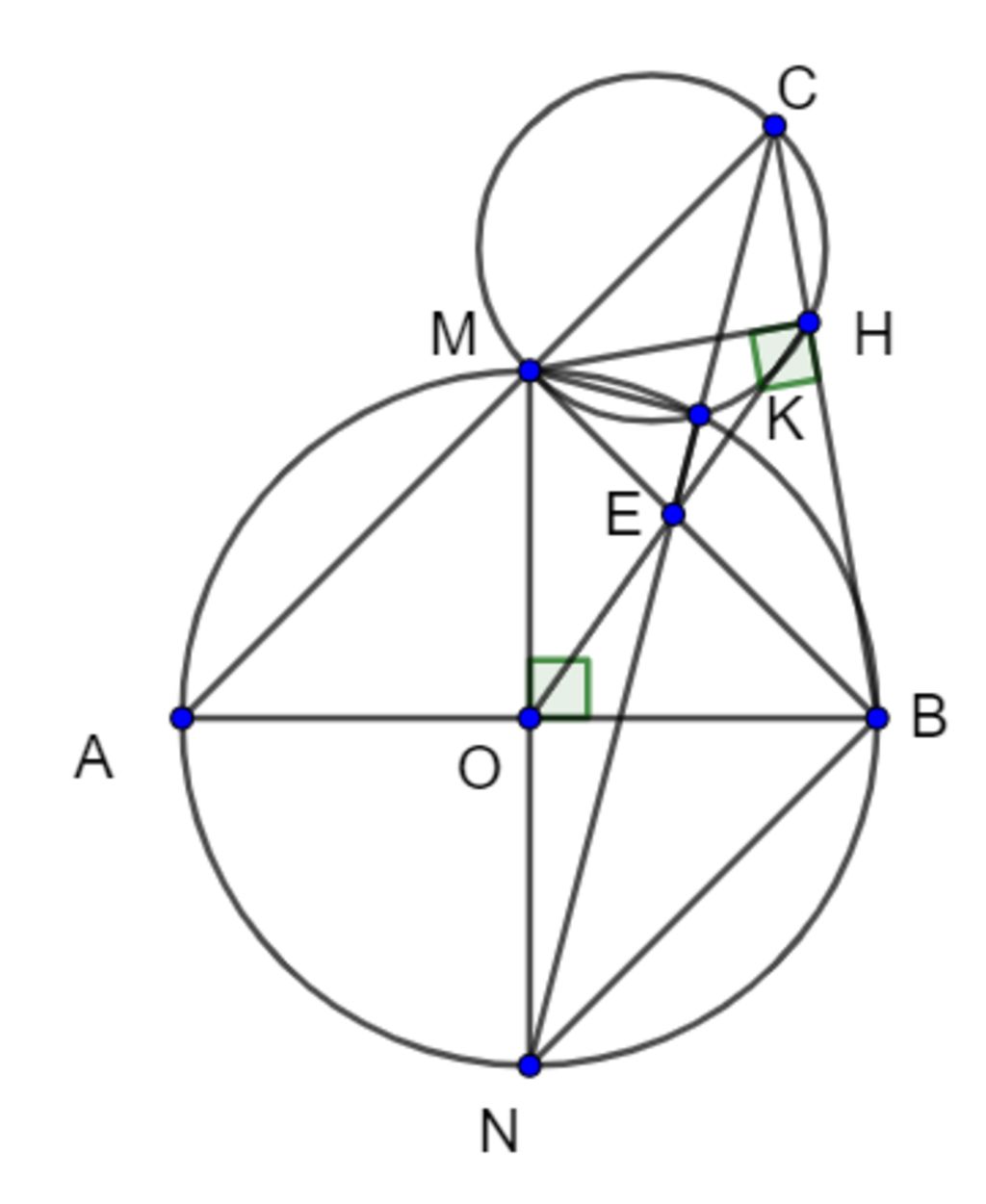 c) `\hat{MHC}=90^0 =>` đường tròn ngoại tiếp `ΔMHC` có đường kính `MC`