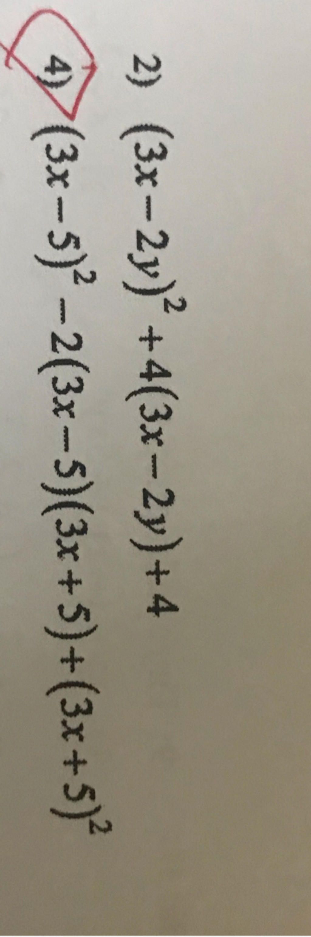 `4, (3x - 5)^2- 2(3x - 5)(3x + 5) + (3x + 5)^2`