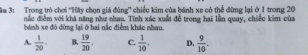 - Trong lần quay đầu tiên, xác suất để chiếc kim dừng lại ở bất kỳ nấc điểm nào là 1/20.