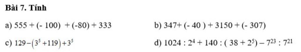 `d) 1024 : 2^4 + 140 : ( 38 + 2^5 ) - 7^23 : 7^21`