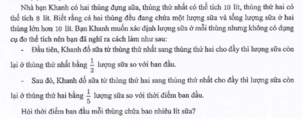 Đầu tiên, Khi bạn Khanh đổ lượng sữa từ thùng $\text{1}$ sang thùng $\text{2}$ cho đầy thì lượng sữa của cả $\text{2}$ thùng sau đó là: