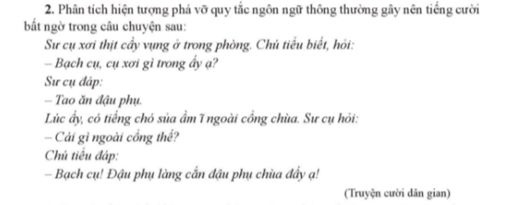 2. Phân tích hiện tượng phá vỡ quy tắc ngôn ngữ thông thường gây nên tiếng cười bất ngờ trong câu chuyện sau: