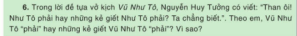 6. Trong lời đề tựa vở kịch Vũ Như Tô, Nguyễn Huy Tưởng có viết: “Than ôi! Như Tô phải hay những kẻ giết Như Tô phải? Ta chẳng biết.". Theo em, Vũ Như Tô “phải” hay những kẻ giết Vũ Như Tô “phải”? Vì sao?
