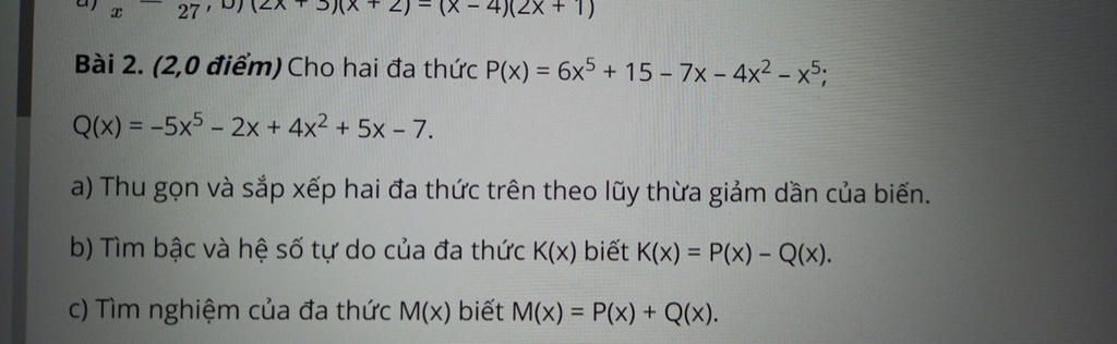 Vậy: Bậc của đa thức `K(x)` là `5`; Hệ số tự do của đa thức `K(x)` là `22`
