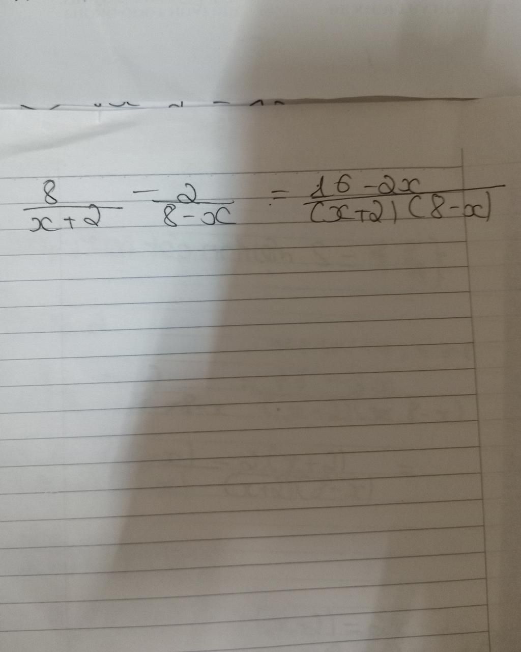 `8/(x + 2) - 2/(8 - x) = (16 - 2x)/[(x + 2).(8 - x)]` `(x \ne -2; x \ne 8)`