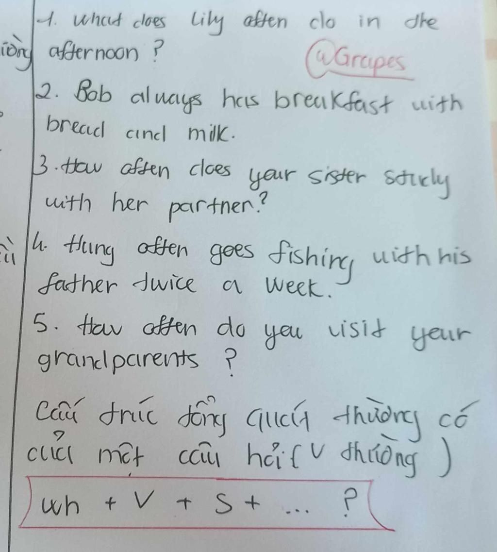 `-` Câu hỏi thì hiện tại đơn: Do/does + S + Vinf?, in the afternoon: vào buổi chiều