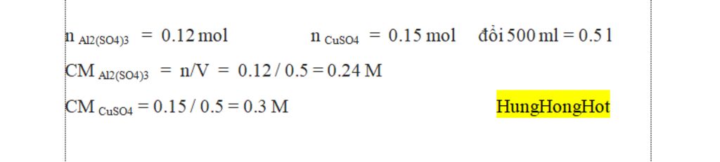 Hòa tan 41,04 gam Al2(SO4)3 và 24,0 gam CuSO4 vào nước để thu được 500 ml dung dịch X. Tính nồng độ mol của các chất có trong dung dịch X?