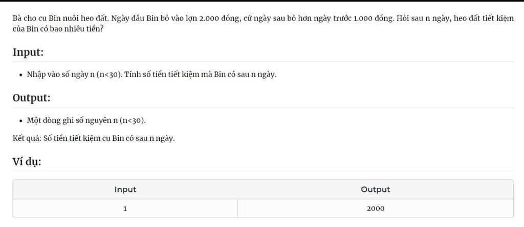 • Nhập vào số ngày n (n<30). Tính số tiền tiết kiệm mà Bin có sau n ngày.
