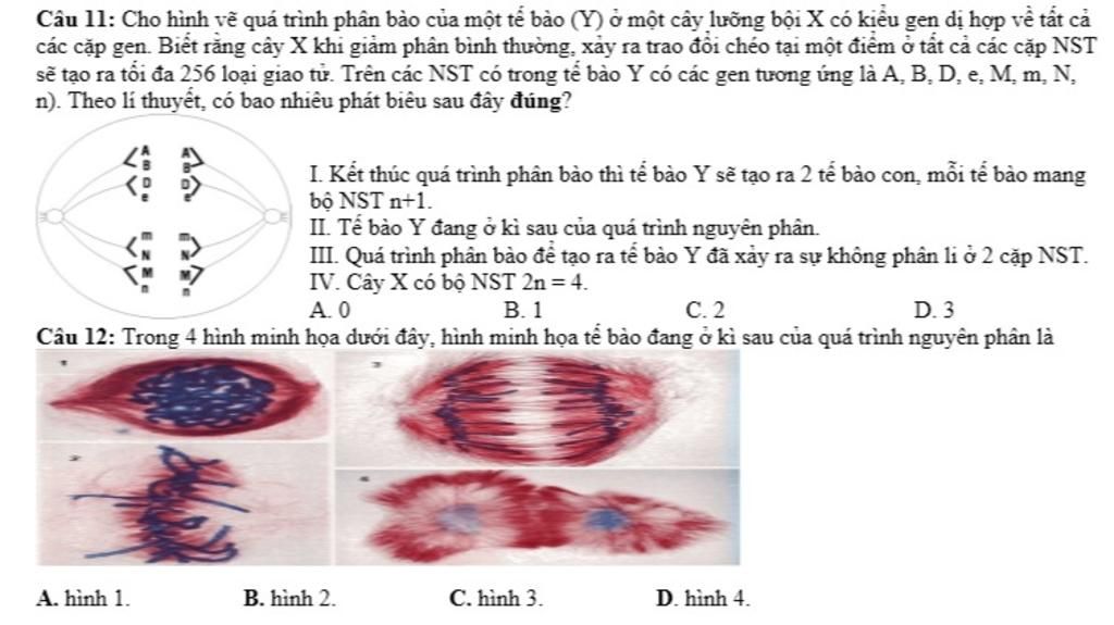 Câu 1 Ta thấy có 2 cặp NST mang 2 cặp gen M,m và N,n còn cặp NST mang gen A,B,D,e chỉ có 1 nên ta có thể kết luận cặp NST mang gen M,m và N,n không phân ly trong giảm phân I, tế bào đang ở kỳ sau giảm phân II II sai, III sai (chỉ không phân ly ở 1 cặp NST)