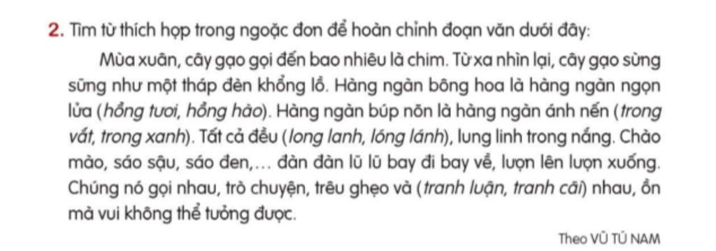 2. Tìm từ thích họp trong ngoặc đon để hoàn chỉnh đoạn văn dưới đây: