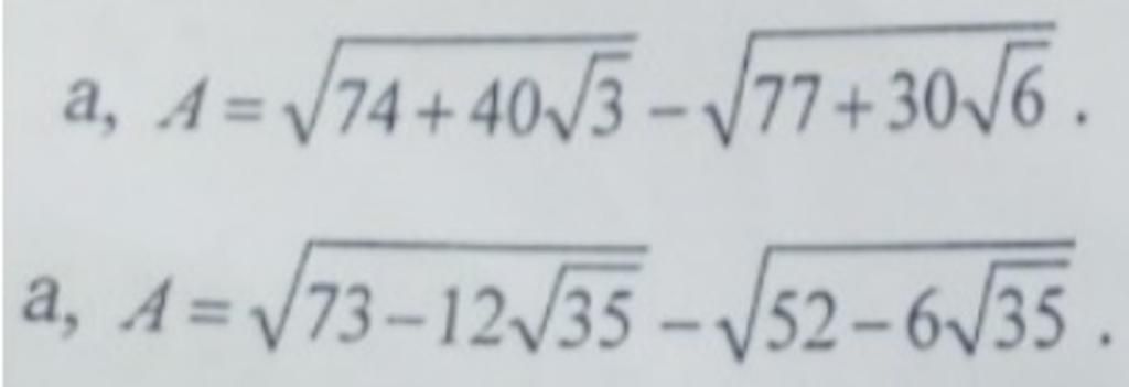 `a)A=\sqrt{74+40\sqrt{3}}-\sqrt{77+30\sqrt{6}}`