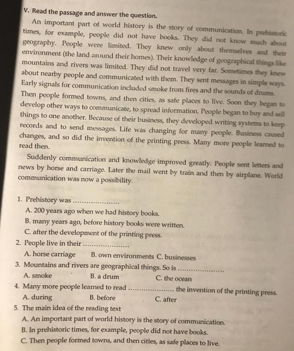`-` Ta thấy ở câu đầu đoạn trích chính là câu chủ đề và sau đó là hàng loạt dẫn chứng và lí lẽ để làm rõ luận điểm, nổi bất lên ý chính của bài đọc. Như là ở đoạn đầu viết những con người thời tiền sử giao tiếp và liên lạc bằng cách đưa ra tín hiệu. Sau đó là mọi người gửi thư và tin tức bằng ngựa và xe ngựa và rồi thư được chuyển bằng tàu hỏa và sau đó bằng máy bay. Vậy nên ở đây bài đọc muốn nói lên cách giao tiếp được hình thành như thế nào `->` Ta chọn đáp án `A`.