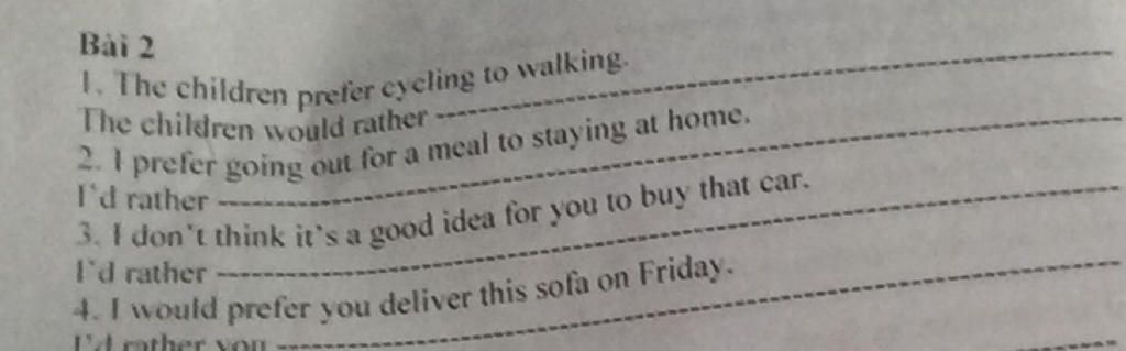 `-` S + would rather + O(người) + V2/V(quá khứ) + O ... : Ai đó khuyên ai làm gì ...