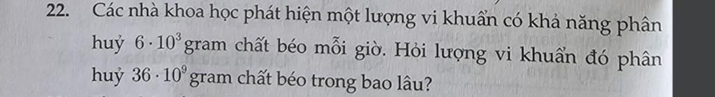 Vậy thời gian phân hủy `36.10^9` gram chất béo là : `6.10^6` giờ
