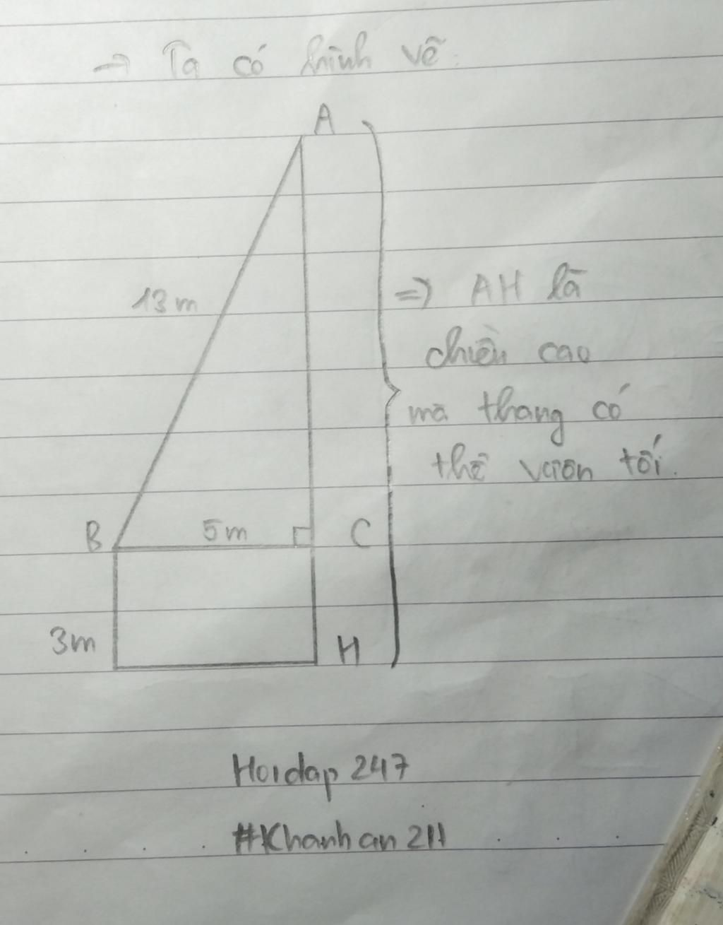 - Ta có: Thang của chiếc xe, mặt đất và tường của tòa nhà khi đc dựng lên -> tạo ra một tam giác vuông ( như hình vẽ trong ảnh ).